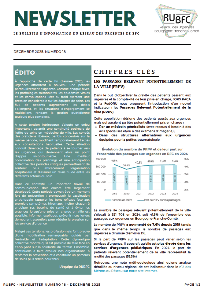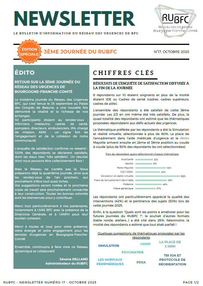 Le Réseau des Urgences de BFC a mis en place sa Newsletter avec un objectif : tenir informés les professionnels de santé des travaux du RUBFC, des actualités et des projets soutenues par les partenaires et institutions, dans le domaine des urgences en Bourgogne-Franche-Comté. La première Newsletter du Réseau a été publiée en Janvier 2022. Vous pouvez retrouver tous les numéros ci-dessous.